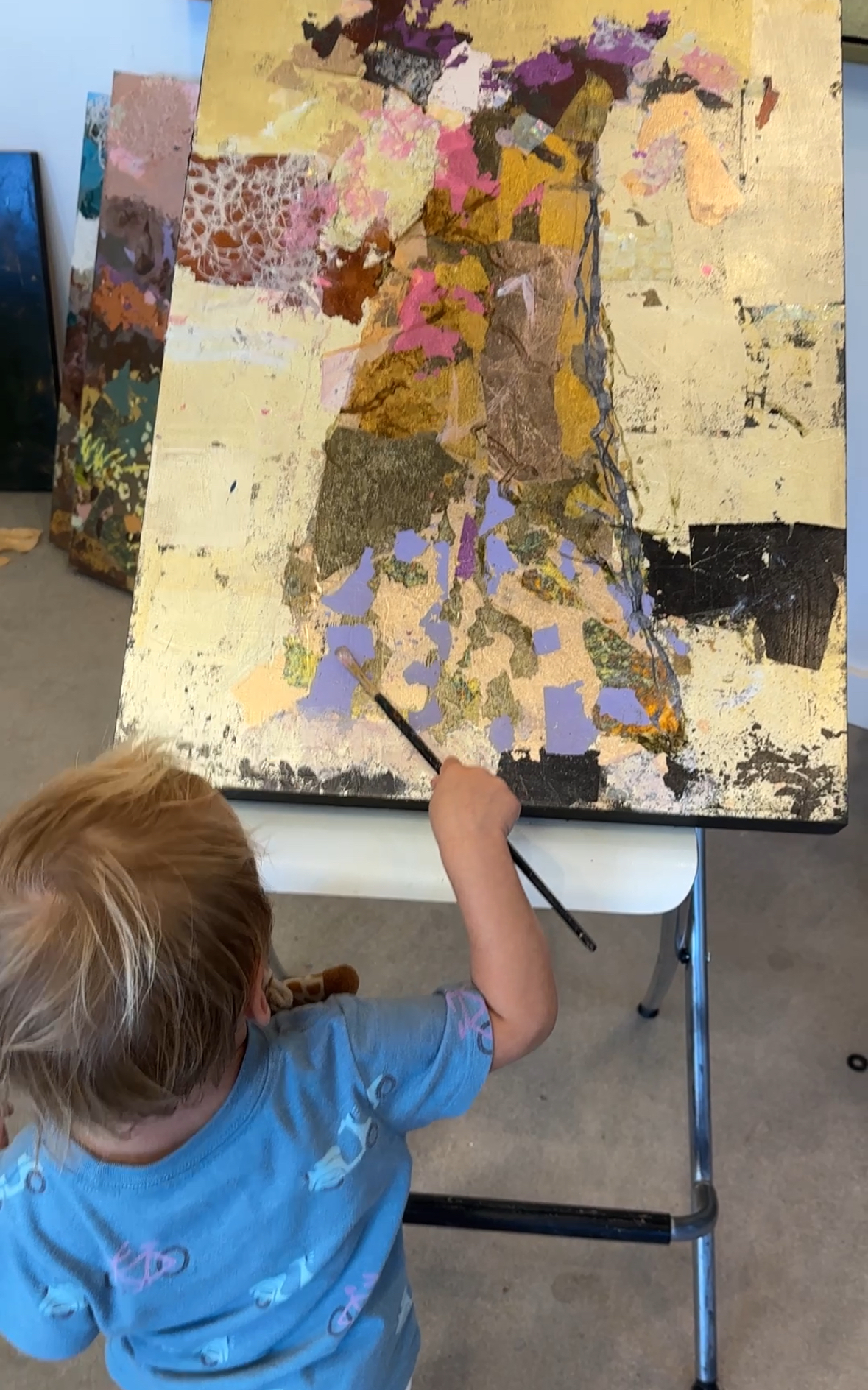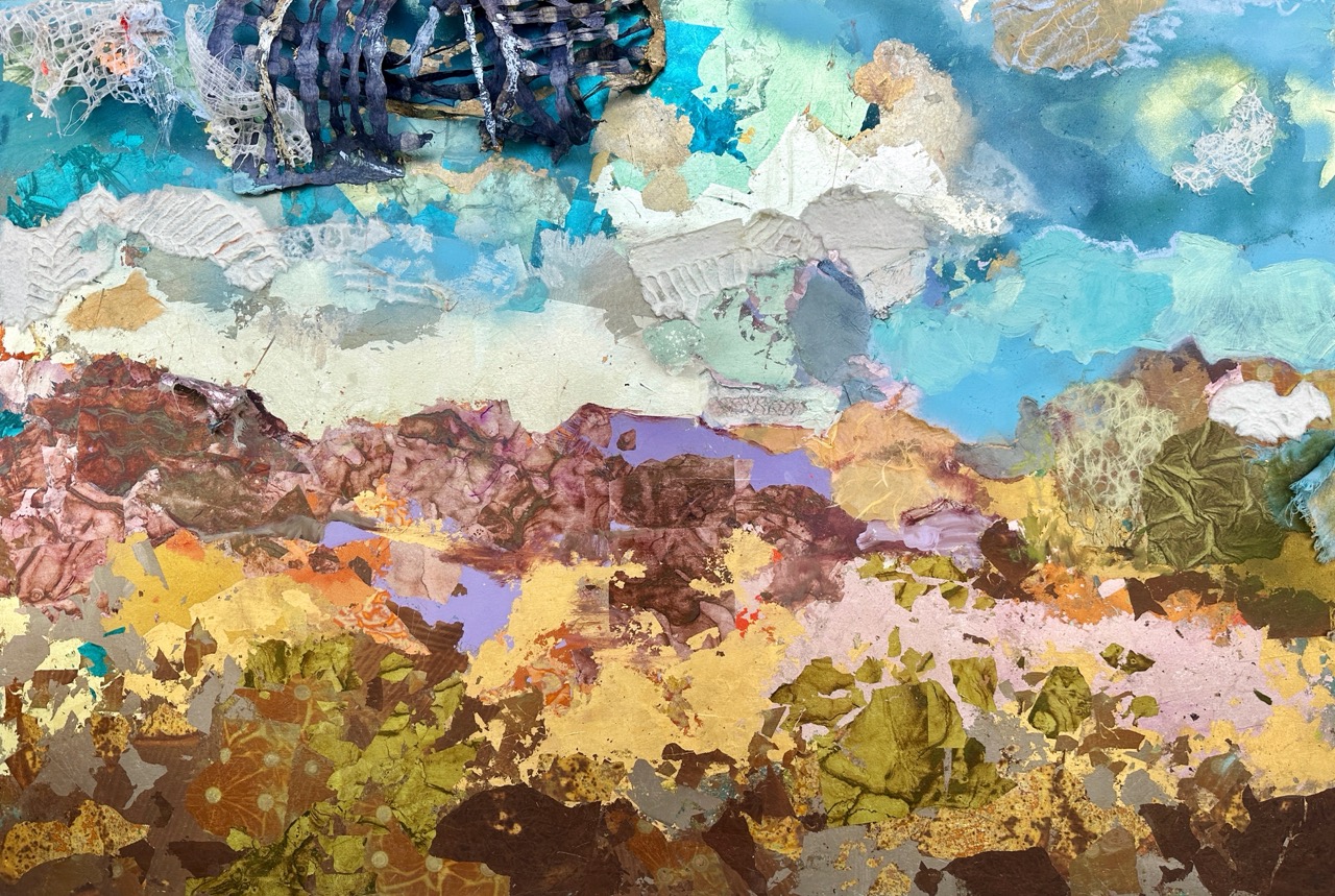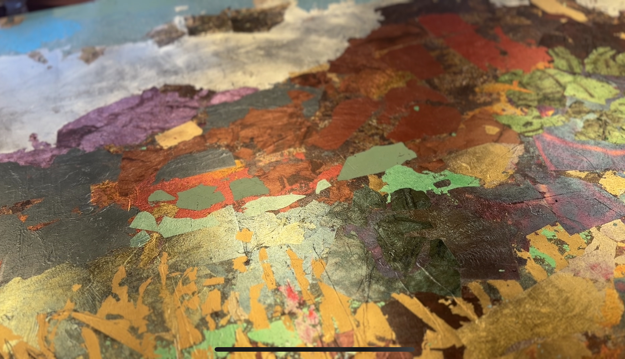 In this painting, I removed some of the paper elements I loved experientially but that blocked the visual flow on a flat surface. What remains feels both resolved and open—like a breath of fresh air, clearing space for the next piece to emerge.