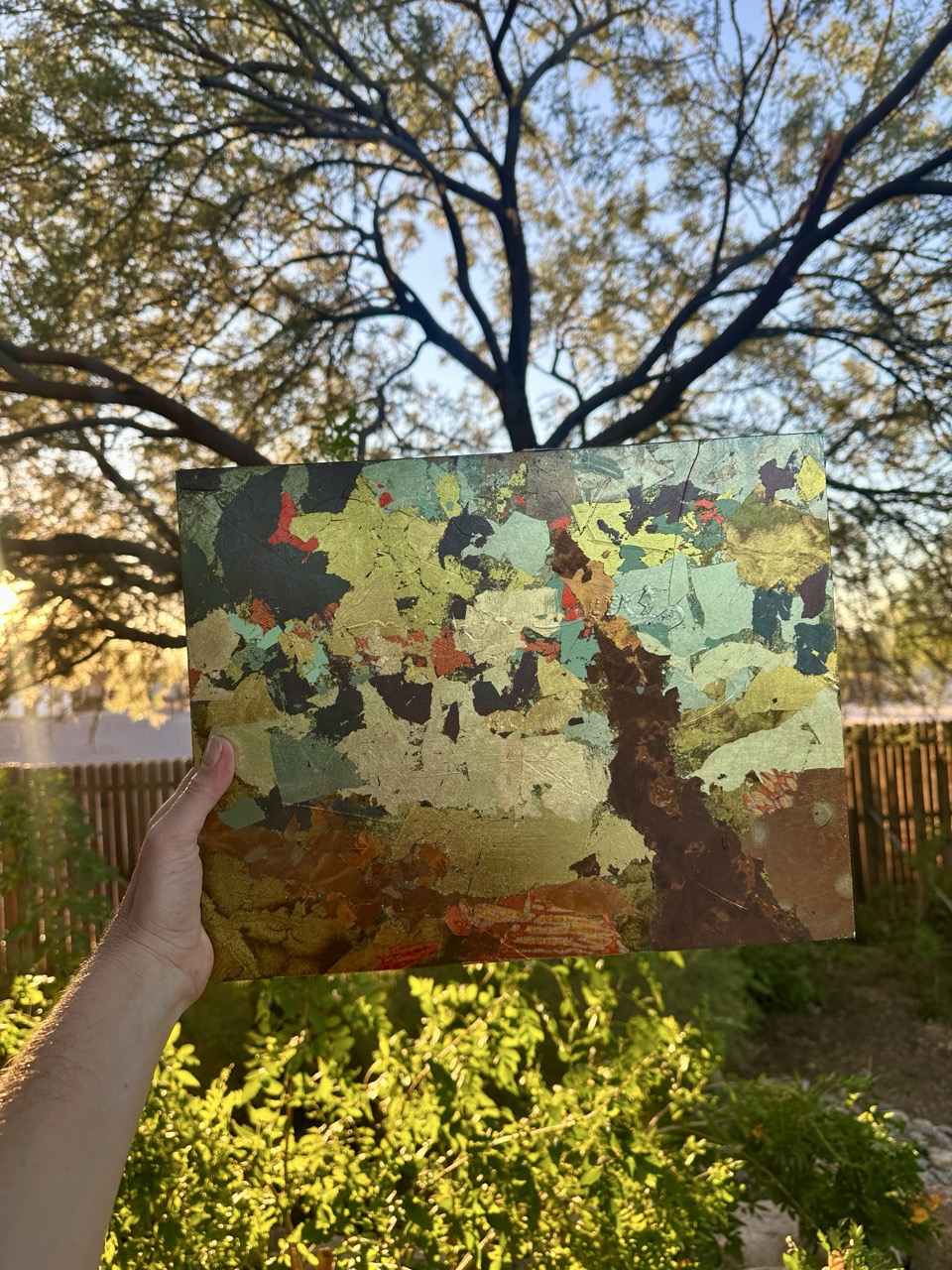 This one is in it's in-between stages- trying to capture my favorite moment of light breaking through leaves, inspired by Andre Derain and his "Tree in a Landscape". When I went to photograph it after the first layer of leaf to show you all here, I held it up to the setting sun, with this Palo Verde, and it wasn't until I snapped the photo I realized how perfectly they lined up. Can you believe the magic? Also - it is very distict from the Derain painting! We cannot help but to paint ourselves (our experiences, our roots) into our work, even when drawing inspiration elsewhere.