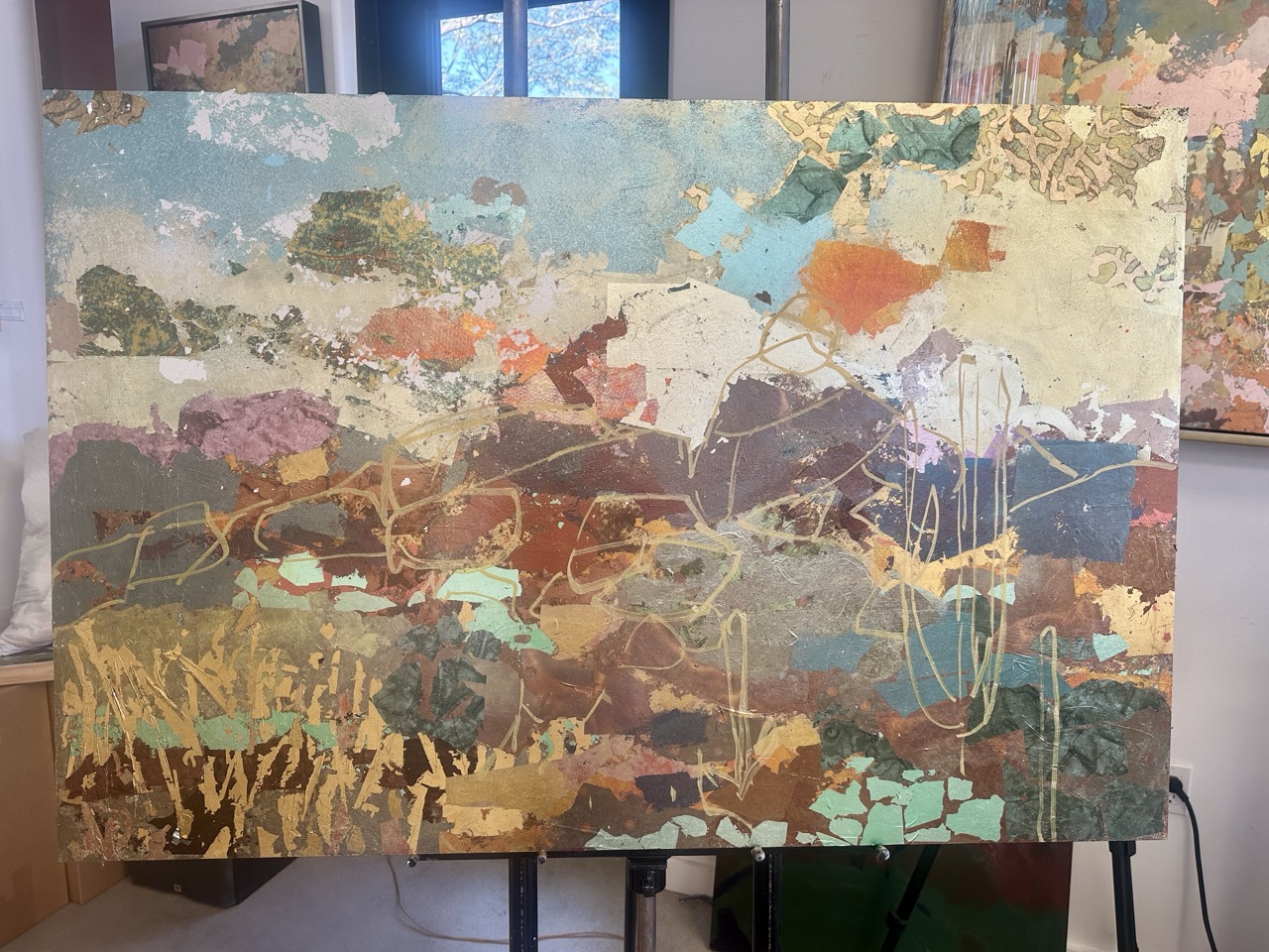 Soft Turns on Hard Edges has been waiting — I knew it wasn't finished. Today I went back in, reworking the bottom half, and somewhere in that process accidentally created the atmospheric mountain skyline I've been trying to figure out for a commission. The layered evening light, the hazy distance — it's been escaping me in gold and silver leaf for months. I wasn't even trying for it today. That's exactly when it arrived.