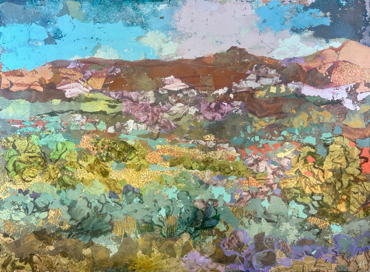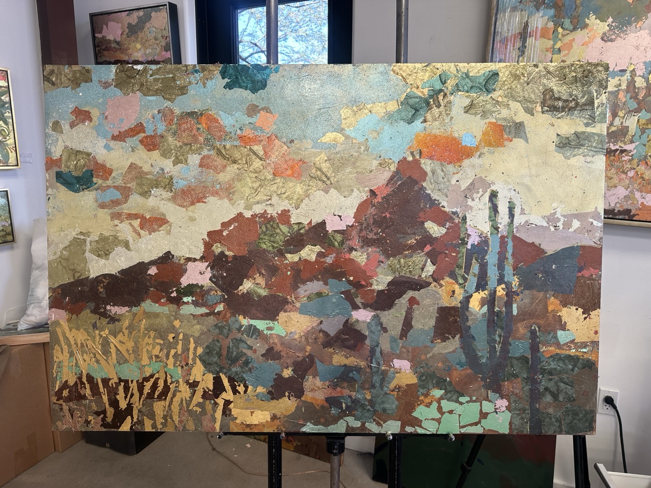 That Mountain Chain is just finished, re-entered and reinvented as part of the Re-Enter Nature series. What I love most is the ambiguity — people see whatever landscape lives closest in their memory. As I worked, it started looking like creosote, then prickly pear, and I made a choice to stop defining it. That's new for me. I used to want you to know exactly what you were seeing. Now I'm interested in the space where you can't be sure — because that's where the real connection to nature lives. We're always trying to classify, separate, distinguish. This work asks you to just be in it.