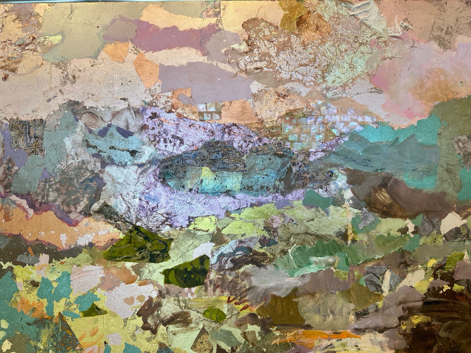 This is part of ReEnter Nature, a growing body of work born from pieces I thought were finished — framed, photographed, done — until something in me said not yet. I go back in. Paper, material, mother of pearl. The work gets bigger than me, which is the point.